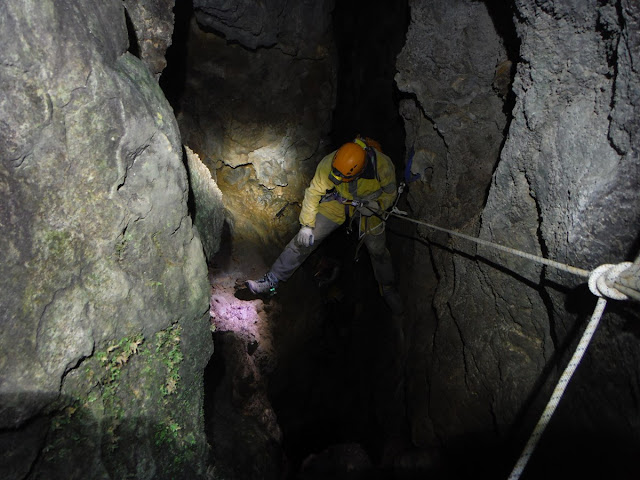 En dirección Sur -que es la opción más evidente- un P-6 nos deja sobre una rampa de piedras, que finaliza en un P-8. Ya descendida esta pequeña vertical, y situándonos en su base, la cavidad finaliza bruscamente a los los 26 m de profundidad. Sin posibilidad de continuación, la cavidad se dio por finalizada.